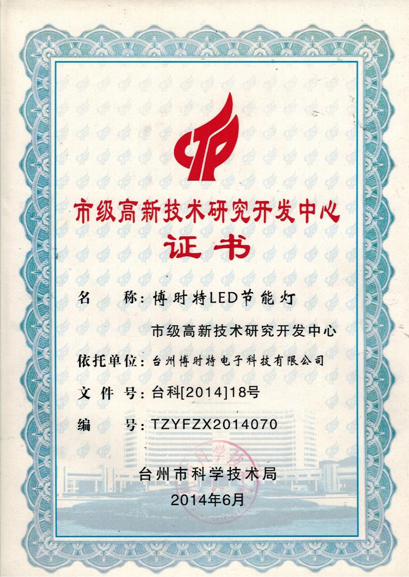 市級(jí)高新技術(shù)研究開(kāi)發(fā)中心證書(shū)